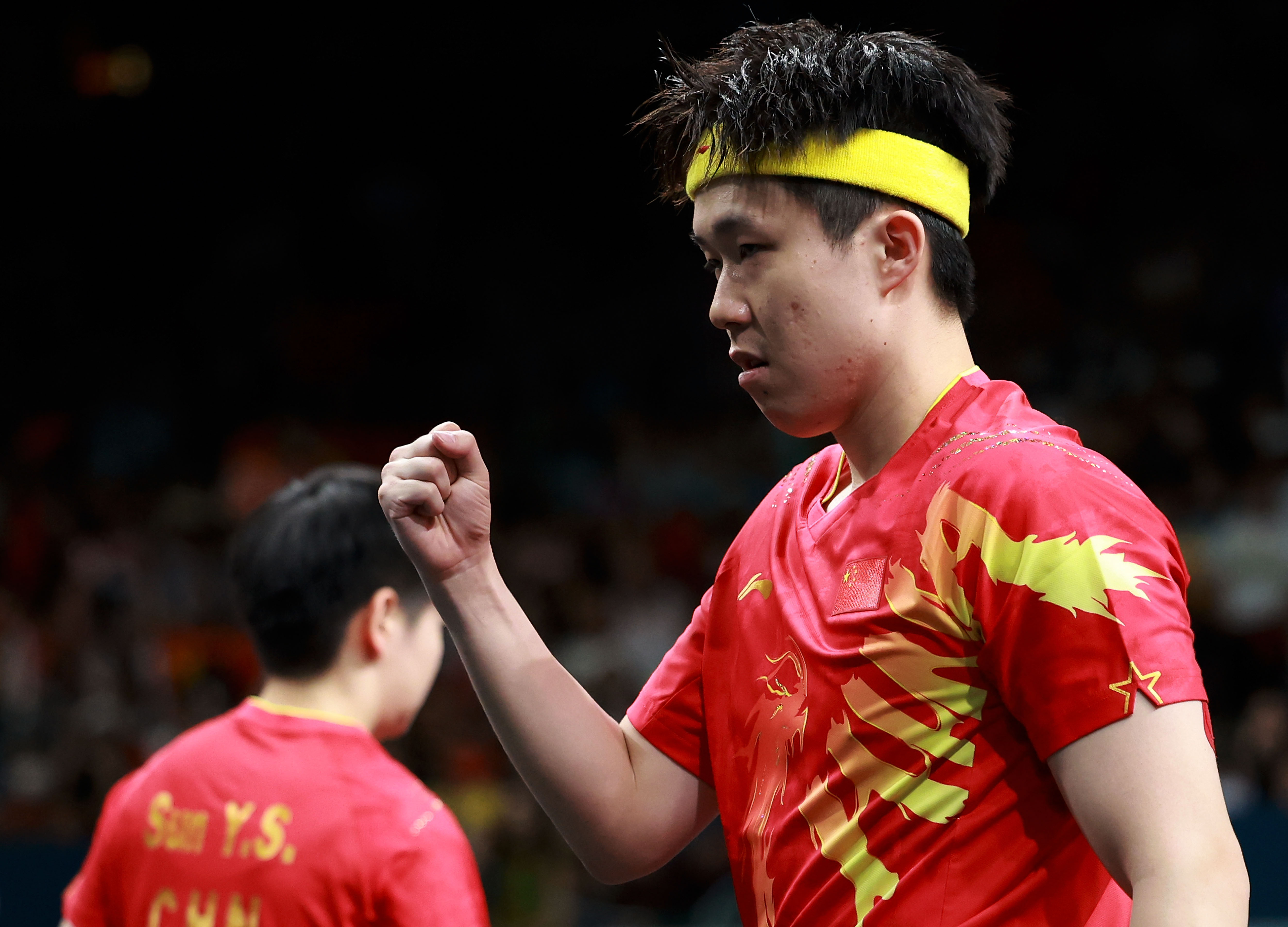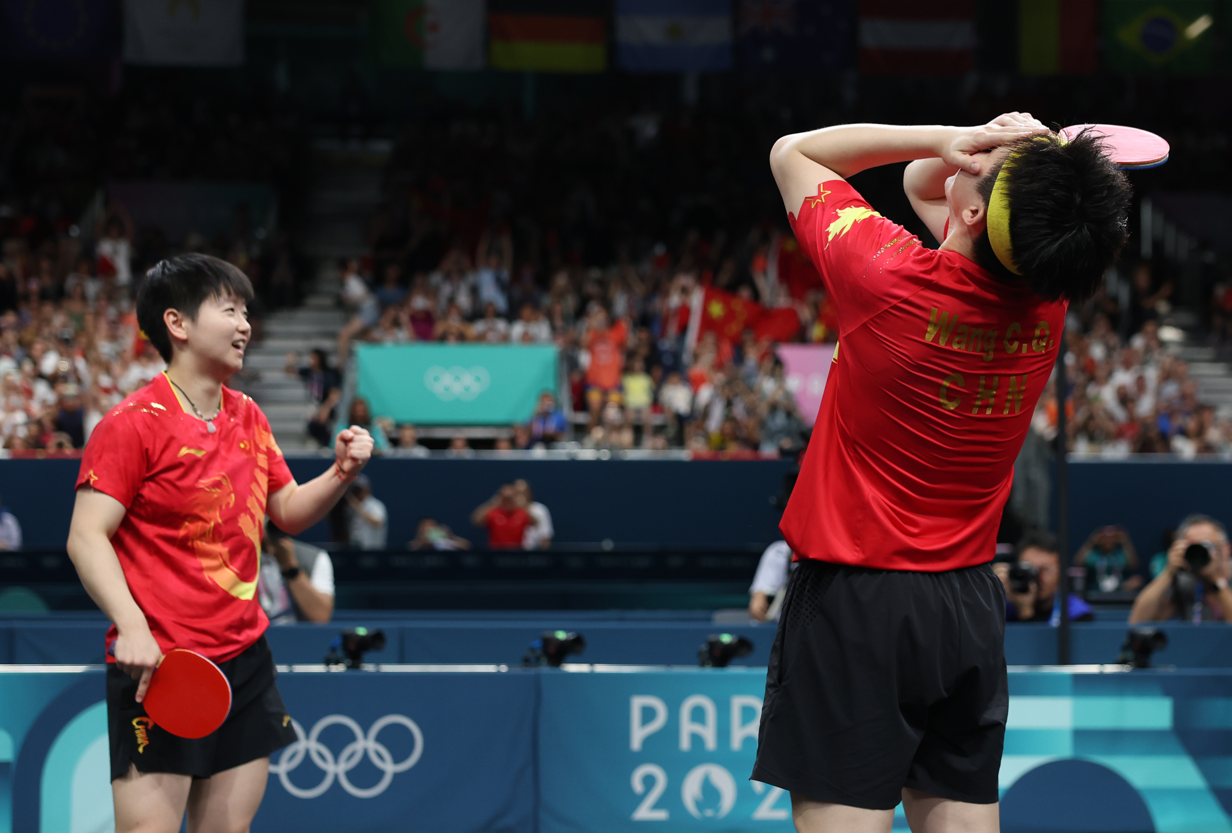 7月30日,王楚钦(右)/孙颖莎在比赛中庆祝得分。