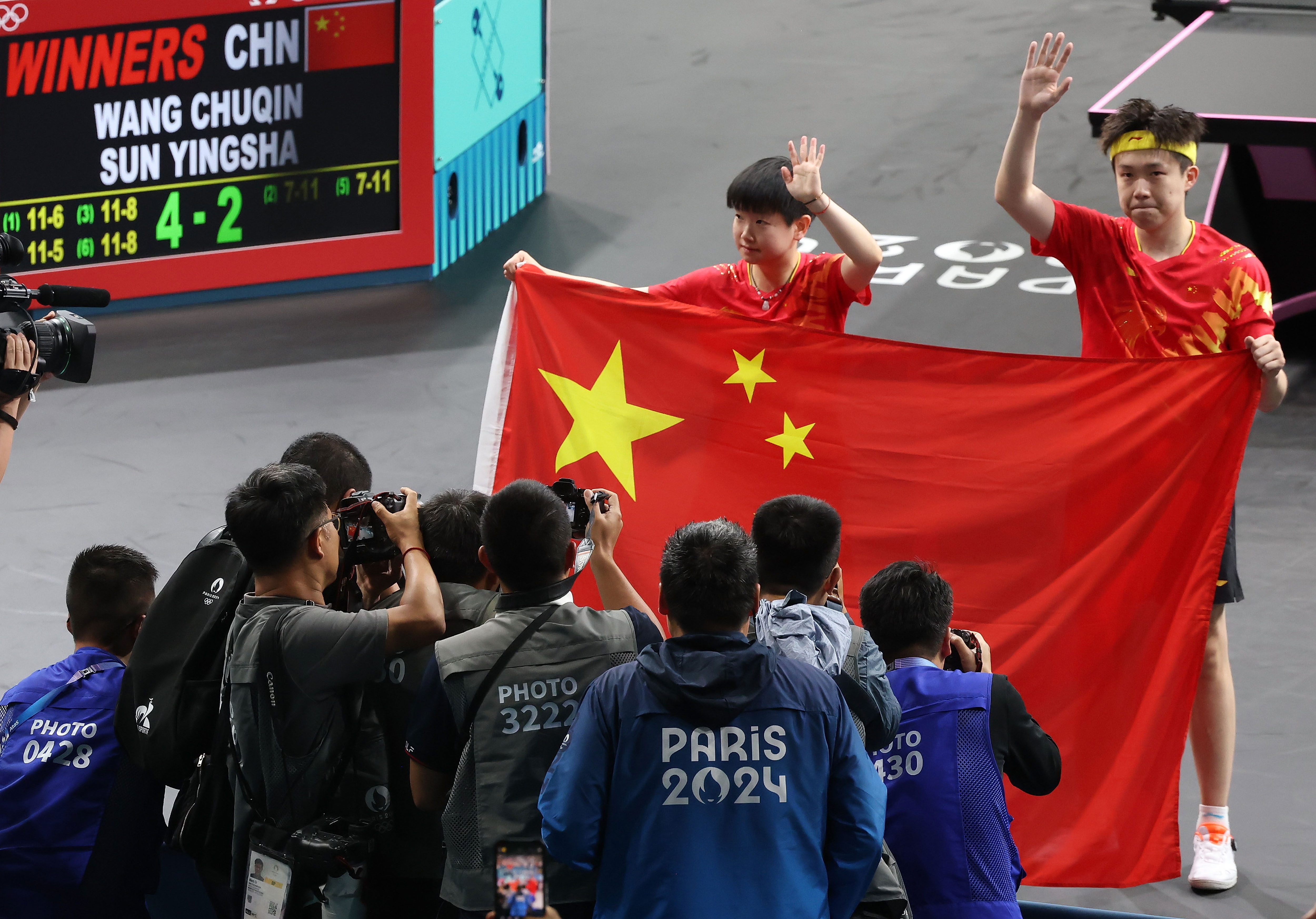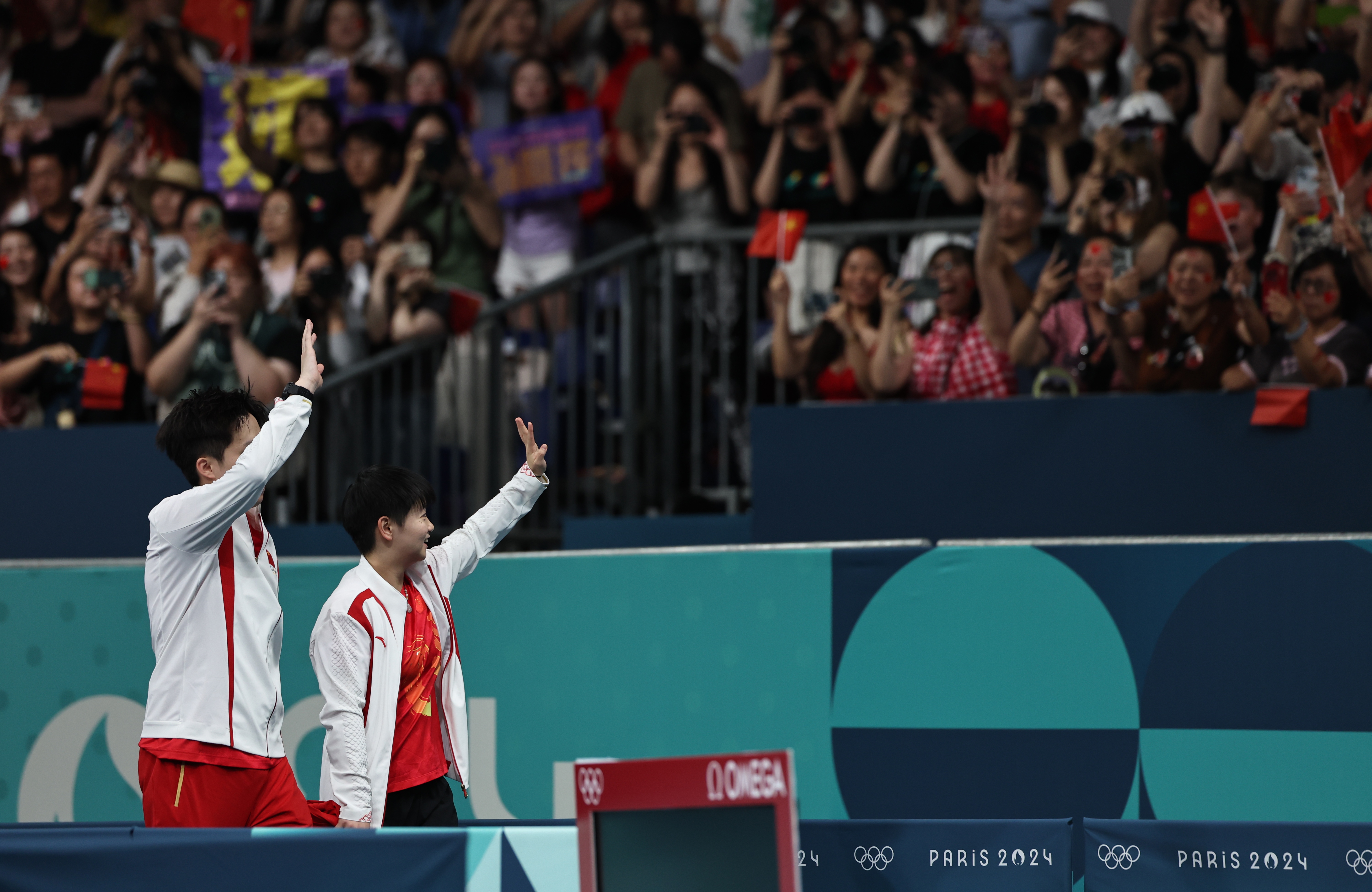7月30日,王楚钦/孙颖莎(右)在比赛后向观众挥手致意。