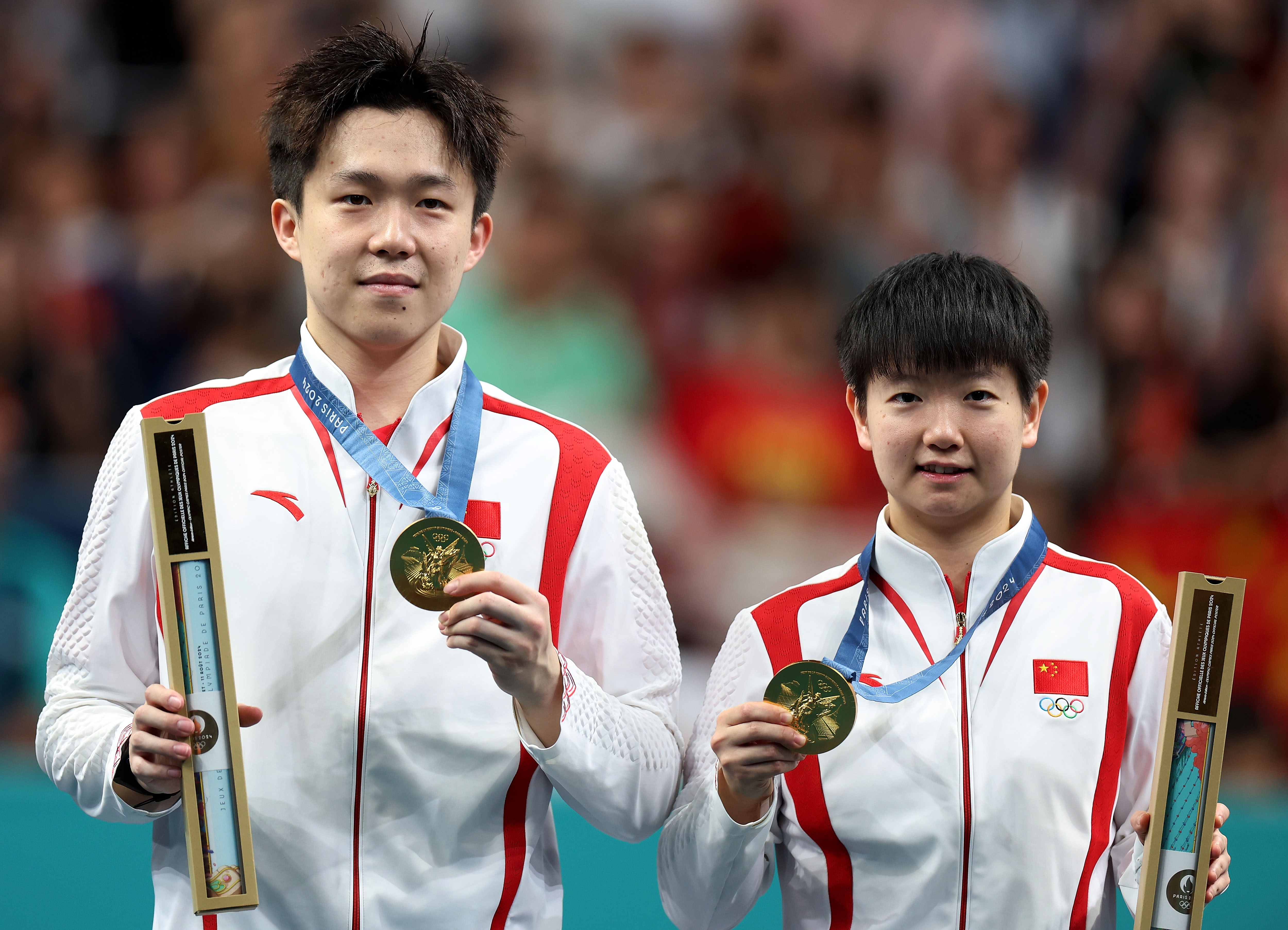 7月30日,冠军中国组合王楚钦(左)/孙颖莎在颁奖仪式上。