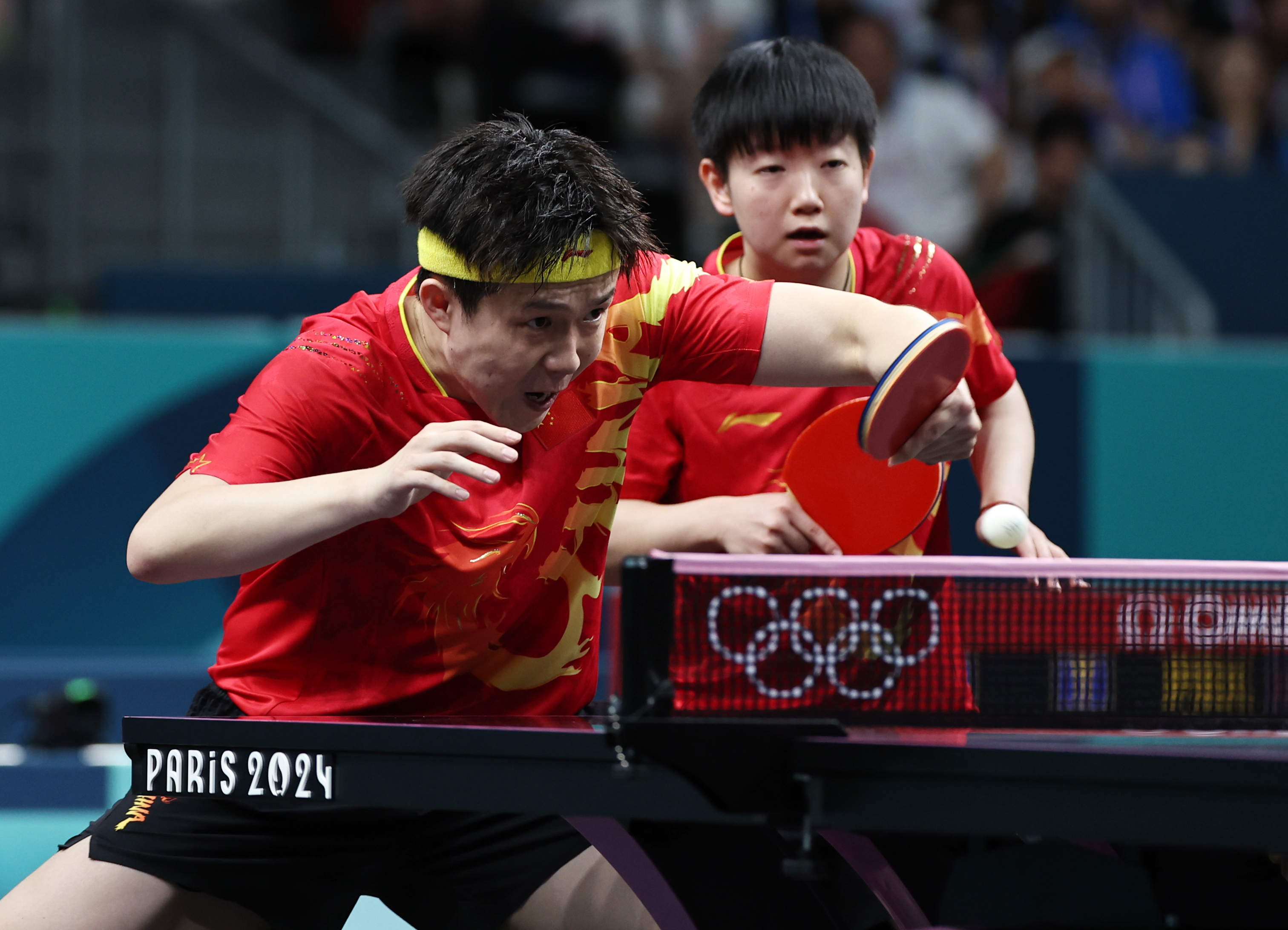 7月30日,王楚钦(左)/孙颖莎在比赛中。当日,在巴黎奥运会乒乓球混双决赛中,中国组合王楚钦/孙颖莎4比1战胜朝鲜组合李正植/金琴英,获得冠军。(图片来源:本文图片均自新华社)