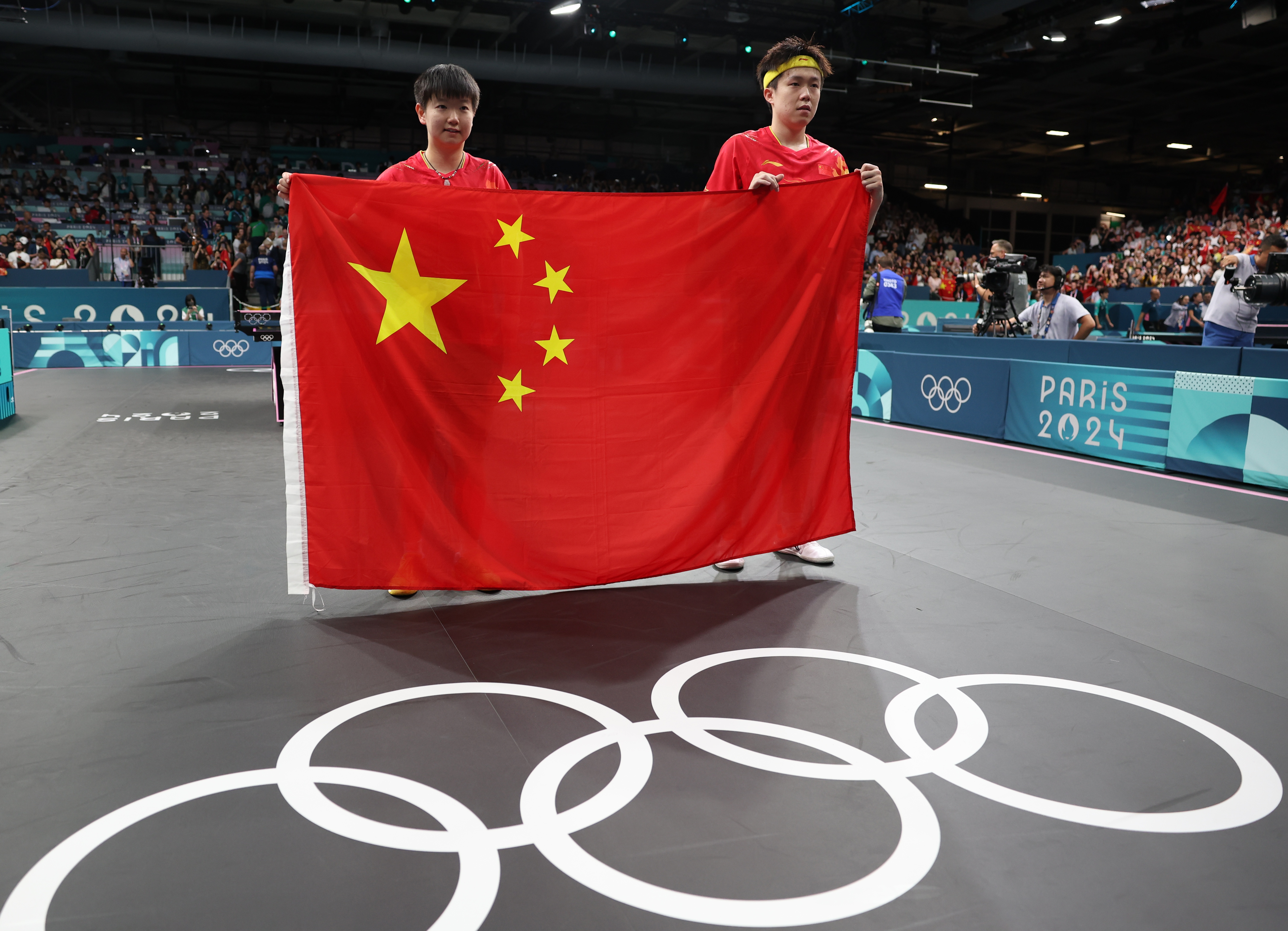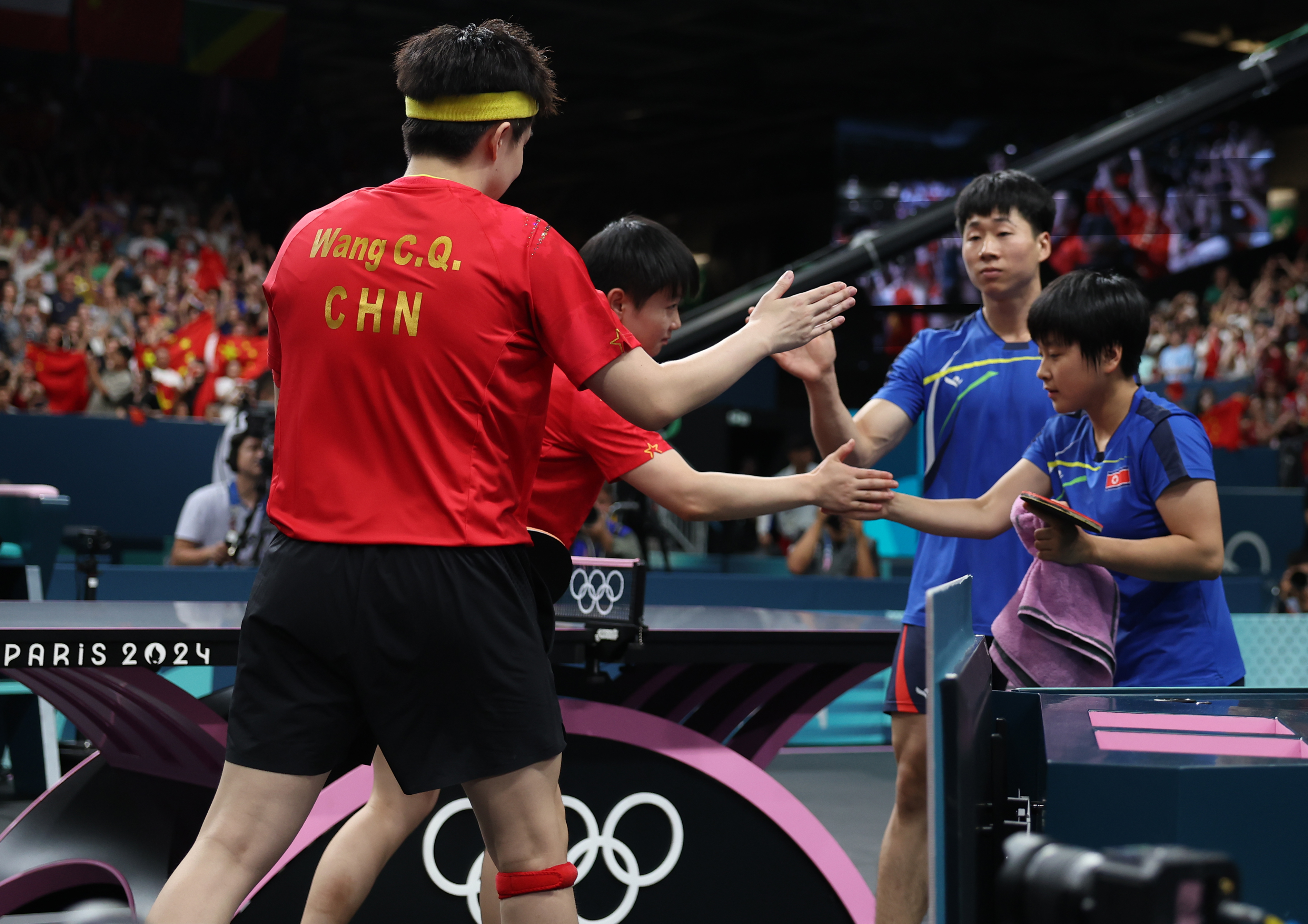 在巴黎奥运会乒乓球混双决赛中,中国组合王楚钦/孙颖莎4比1战胜朝鲜组合李正植/金琴英,获得冠军。