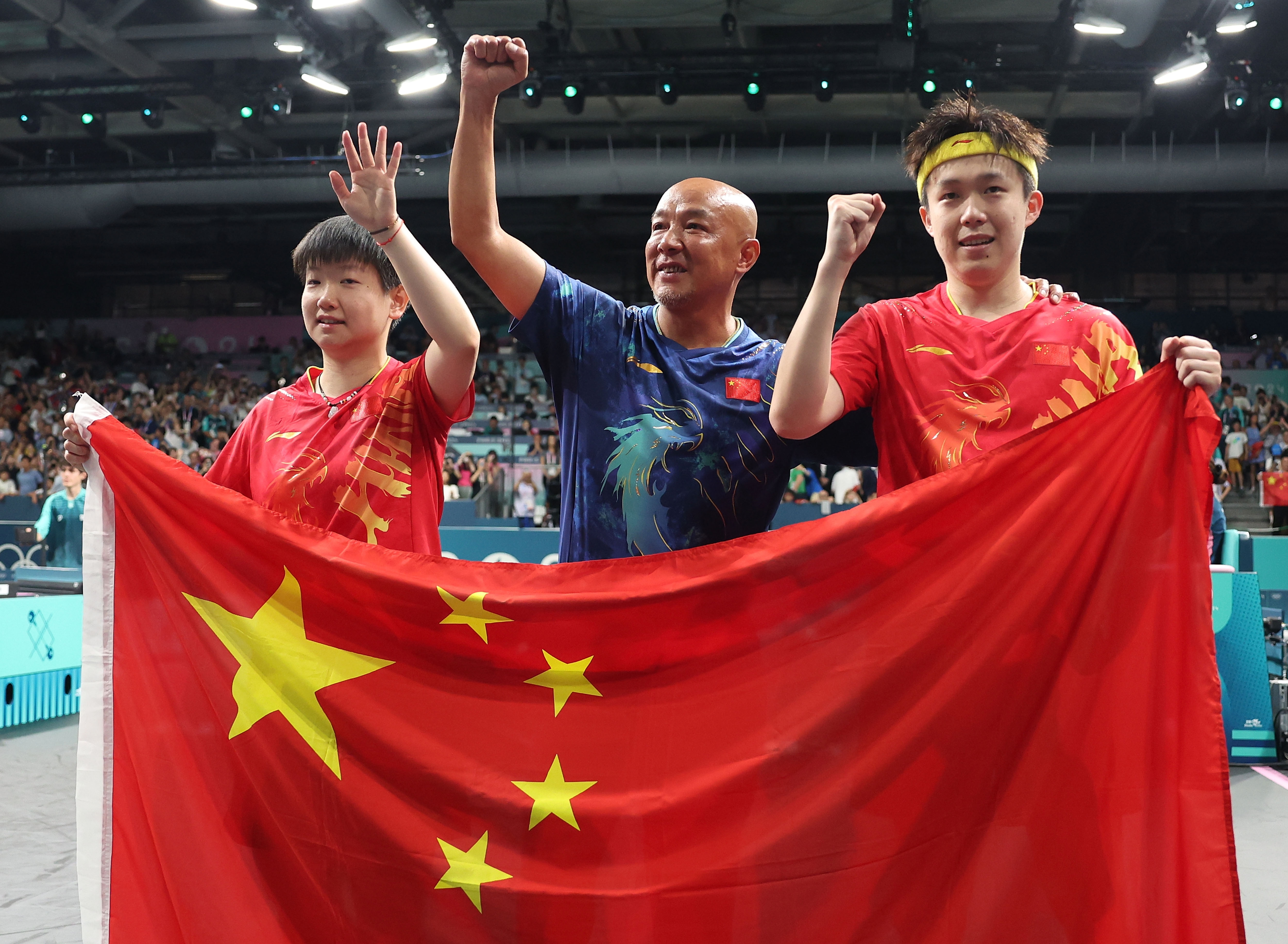 7月30日,王楚钦(右)、孙颖莎(左)和教练肖战在赛后庆祝。