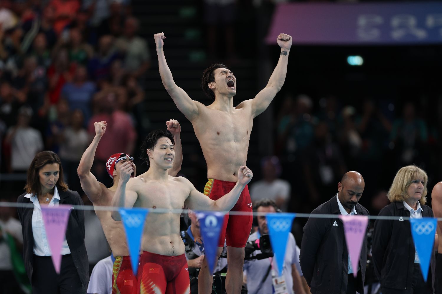 4日,在巴黎奥运会游泳项目男子4x100米混合泳接力决赛中,由徐嘉余、覃海洋、孙佳俊、潘展乐组成的中国队夺得金牌。图为中国队选手在夺冠后庆祝。(图片来源:图片均据中新社)