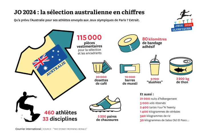 尽管法国美食享誉全球,澳大利亚代表团似乎并不领情。他们携带了三吨金枪鱼和2400个馅饼,以避免品尝法国菜肴(真事)。此外,在一次水球比赛胜利后,澳大利亚的球迷和球员还评论说法国奥运的观众氛围不尽如人意。