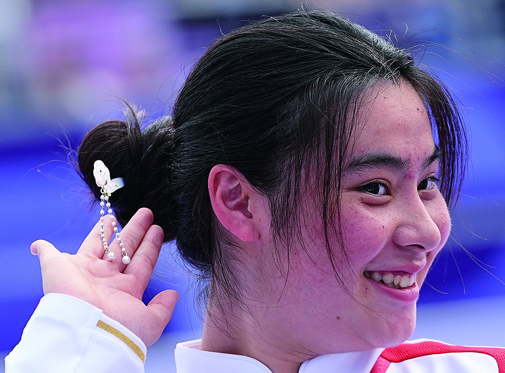自由式小轮车女子公园赛颁奖仪式上,中国选手邓雅文佩戴中式发簪领奖。(图片来源:新华社)