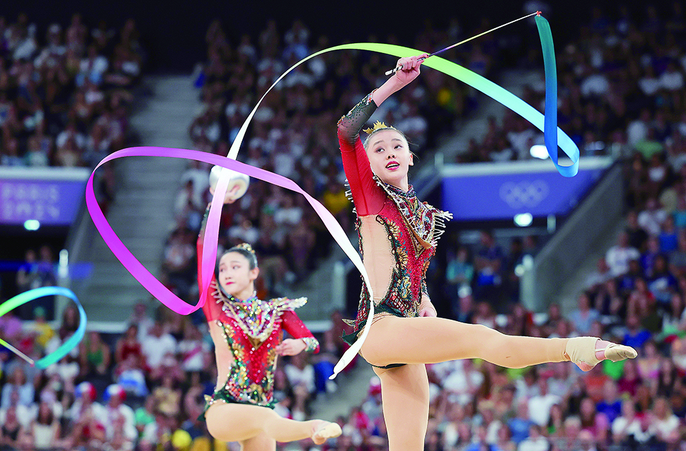在艺术体操项目集体全能决赛中,中国队表演国风曲目《凤鸣凌霄》。(图片来源:新华社)