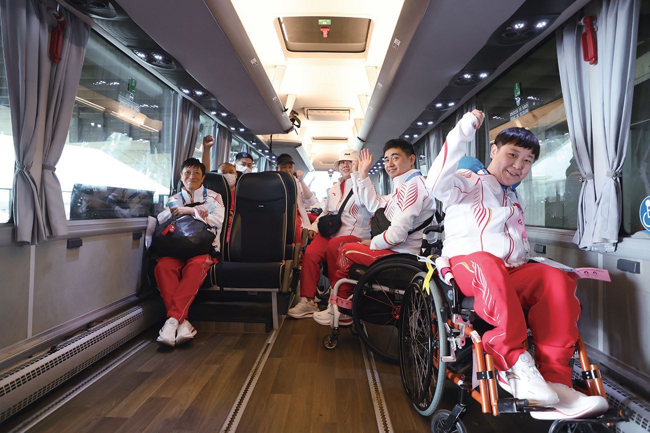 图为参加射击项目的中国残奥运动员在大巴车内。(图片来源:欧洲时报记者马行健 摄)