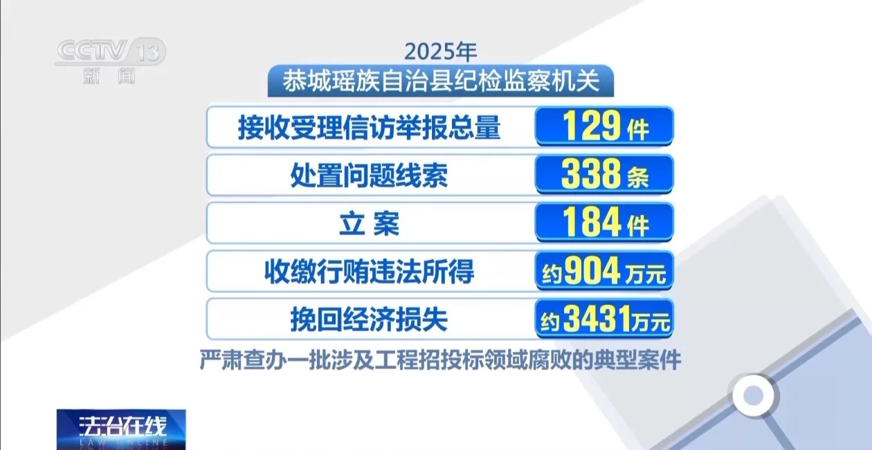 2025年,恭城瑶族自治县纪检监察机关共接收受理信访举报总量129件,处置问题线索338条,立案184件,收缴行贿违法所得约904万元,挽回经济损失约3431万元。严肃查办了一批涉及工程招投标领域腐败的典型案件。
