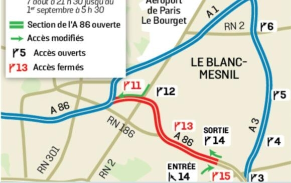 为了修缮三条隧道,巴黎平日里异常繁忙的A86城市高速公路将有一个路段被彻底封闭了,涉及93省境内横跨A1和A3的那段,从8月7日21点30分开始直到9月1日5点30分。