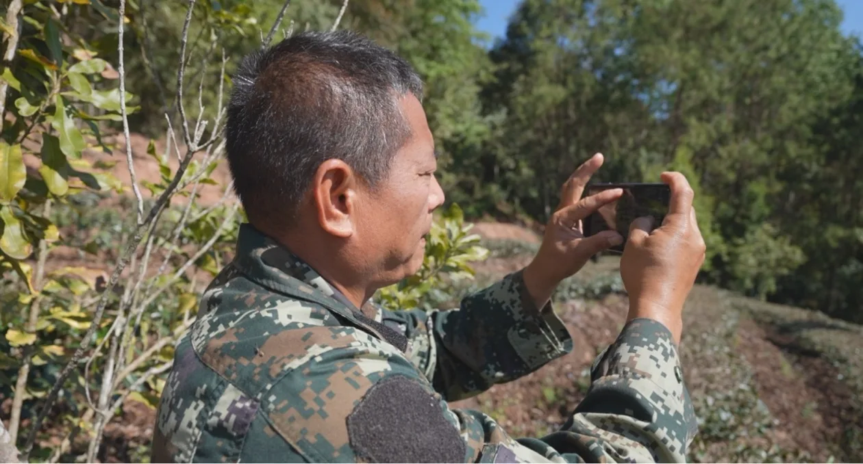 沿着丛林穿梭,刁发兴忽然发现了亚洲象的踪迹,一群象正在玉米地里觅食。他立即打开微信群通知了周边村民,提醒附近的人注意避让。这样的监测与预警工作已经成为监测员与百姓之间的一种默契,除非收到象群离开的信息,否则村民不会来这片区域干活。
