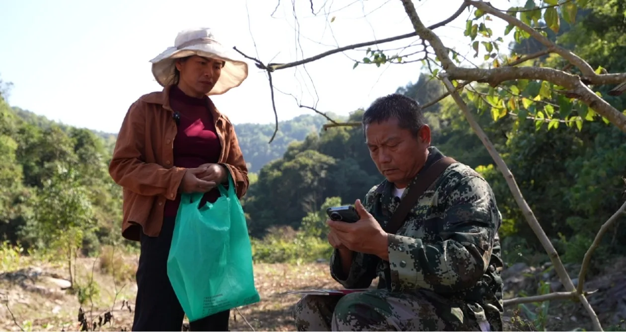 记者与亚洲象监测员和消防员查看无人机画面情况
