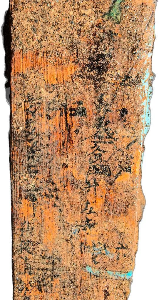 这是墓葬M20墓室北壁出土的带有晕染汉字的屏风木板(资料照片)。