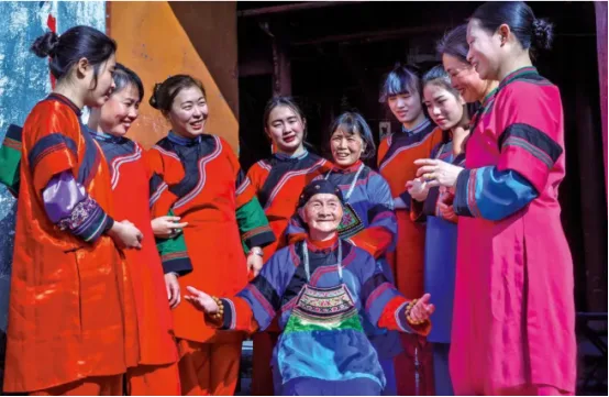 福建畲族男子传统服饰已失传,后与当地汉族相同。畲族女性在春节期间会穿上传统的"凤凰装",这是畲族服饰的代表。凤凰装以红、黄、绿等鲜艳色彩为主,衣裳、围裙上绣有凤凰、喜鹊、梅花、牡丹等吉祥图案,象征着吉祥如意、幸福安康。腰后飘荡的金色腰带头和叮当作响的银饰,更增添了节日的喜庆氛围,寓意着凤凰的灵动与美好。2008年被列入第二批国家级非物质文化遗产名录。
