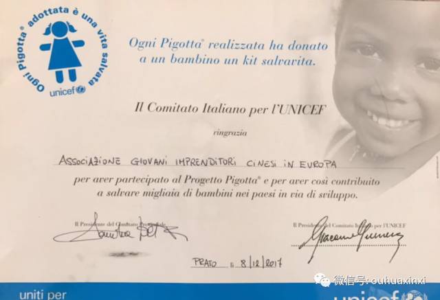 意大利《华人街》一策报道:2017年12月8日晚,欧洲青年企业家协会在意大利佛罗伦萨Calenzano的Mirò大酒店召开首次会员代表大会期间,向“unicef联合国儿童基金会”献爱心,备受社会各界赞誉。