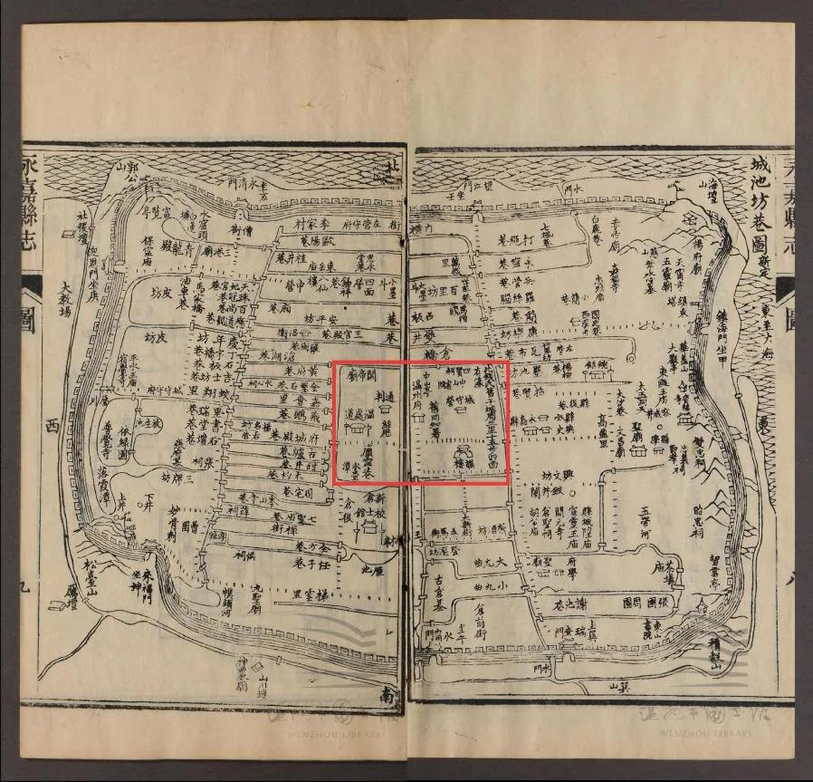 《城池坊巷图》,红框标记处为子城,光绪《永嘉县志》清光绪八年刻本,温州市图书馆藏。