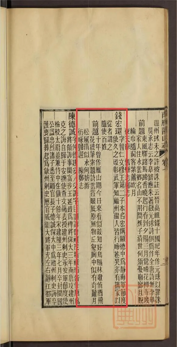 钱元瓘之子钱弘儇尤擅诗文。《十国春秋》记载,钱弘儇“性喜简俭,善骑射,能书有文而自晦”。所作《游南雁荡》诗,气象开阔,情怀超逸,为时人传诵。
